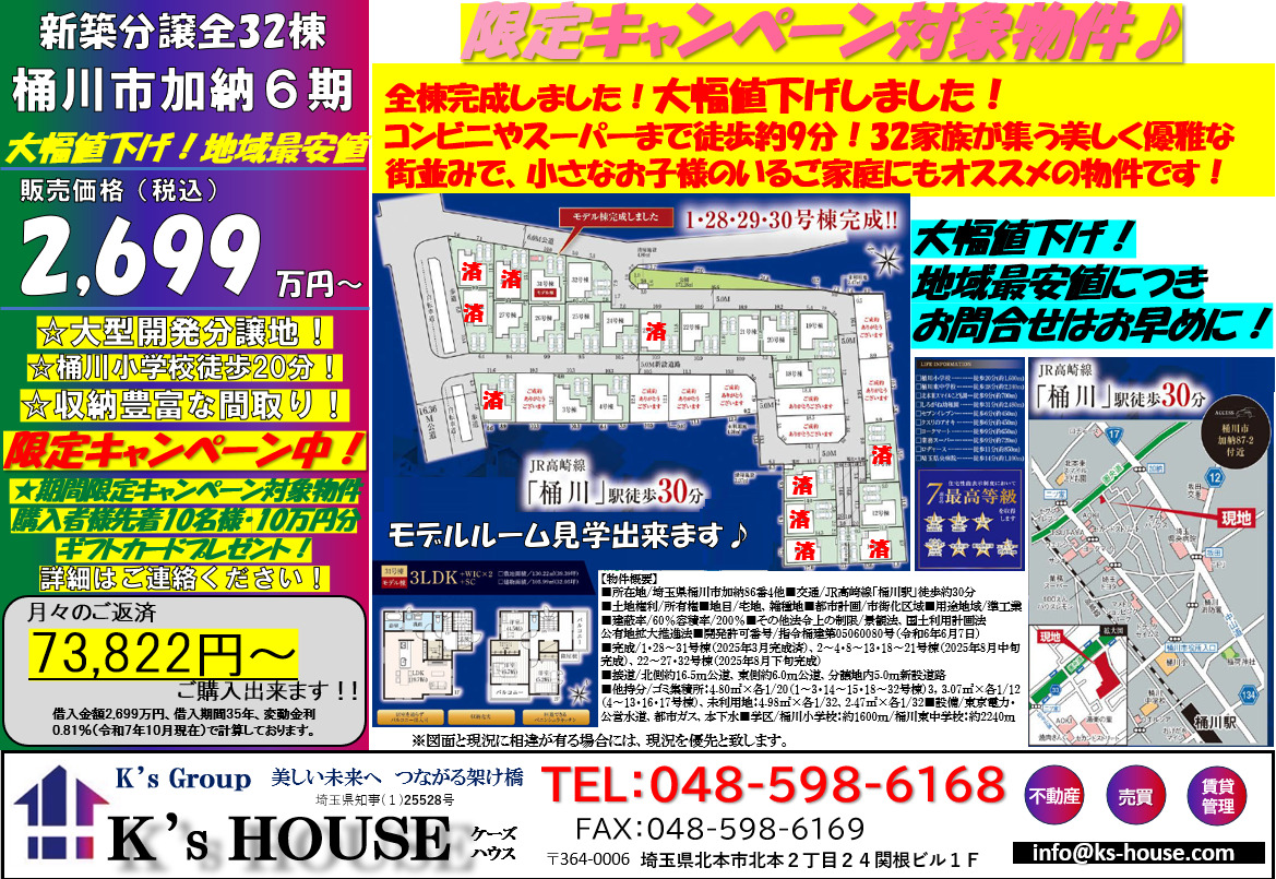 大幅値下げ!200万円DOWN【新築住宅】桶川市加納6期(全32棟)(動画あり)