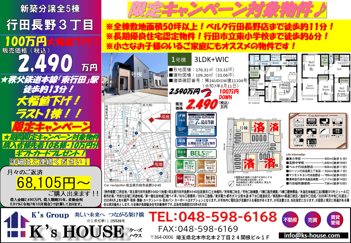 大幅値下げ!100万円DOWN!【新築住宅】行田市長野3丁目・3号棟(全5棟)